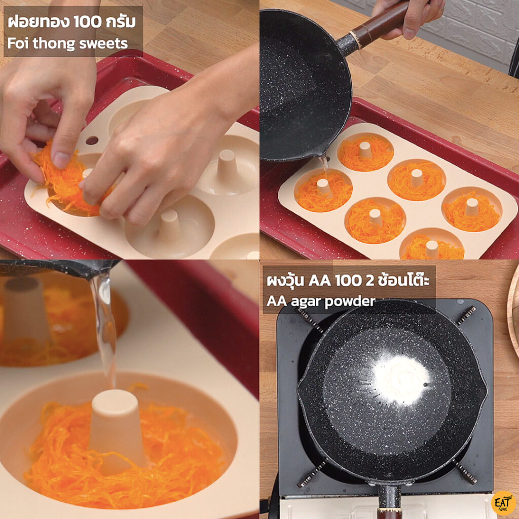 3. เทวุ้นลงในพิมพ์ที่ใส่ฝอยทองไว้แล้ว ทิ้งไว้ให้เซตตัว